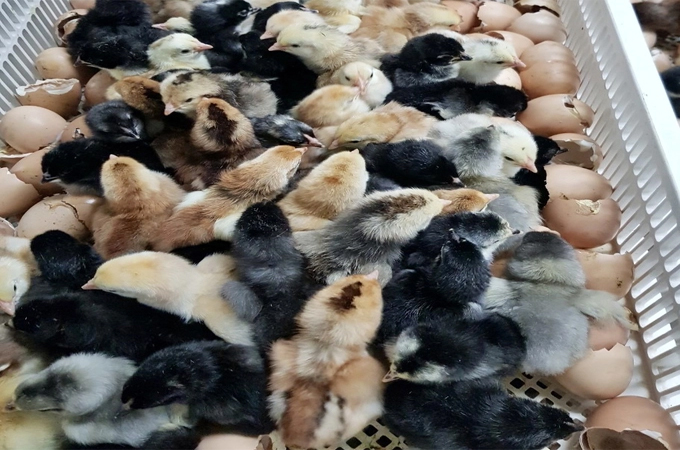 Giống gà Nòi Ngũ Sắc Dabaco 01 ngày tuổi. Ảnh: Nguyên Huân.